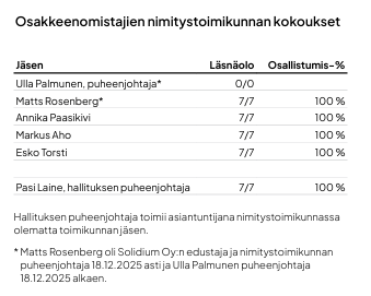 31.12.2025 osakkeenomistajien nimitystoimikunnan jäsenistä kaksi oli miehiä ja kaksi naisia. Nimitystoimikunta kokoontui seitsemän kertaa. Nimitystoimikunnan jäsenten osallistumisprosentti kokouksiin oli 100 prosenttia. Ulla Palmunen aloitti jäsenenä ja puheenjohtajana 18.12.2025, eikä sen vuoksi osallistunut aiemmin vuoden aikana järjestettyihin kokouksiin. Jäsenet osallistuivat kokouksiin seuraavasti:
