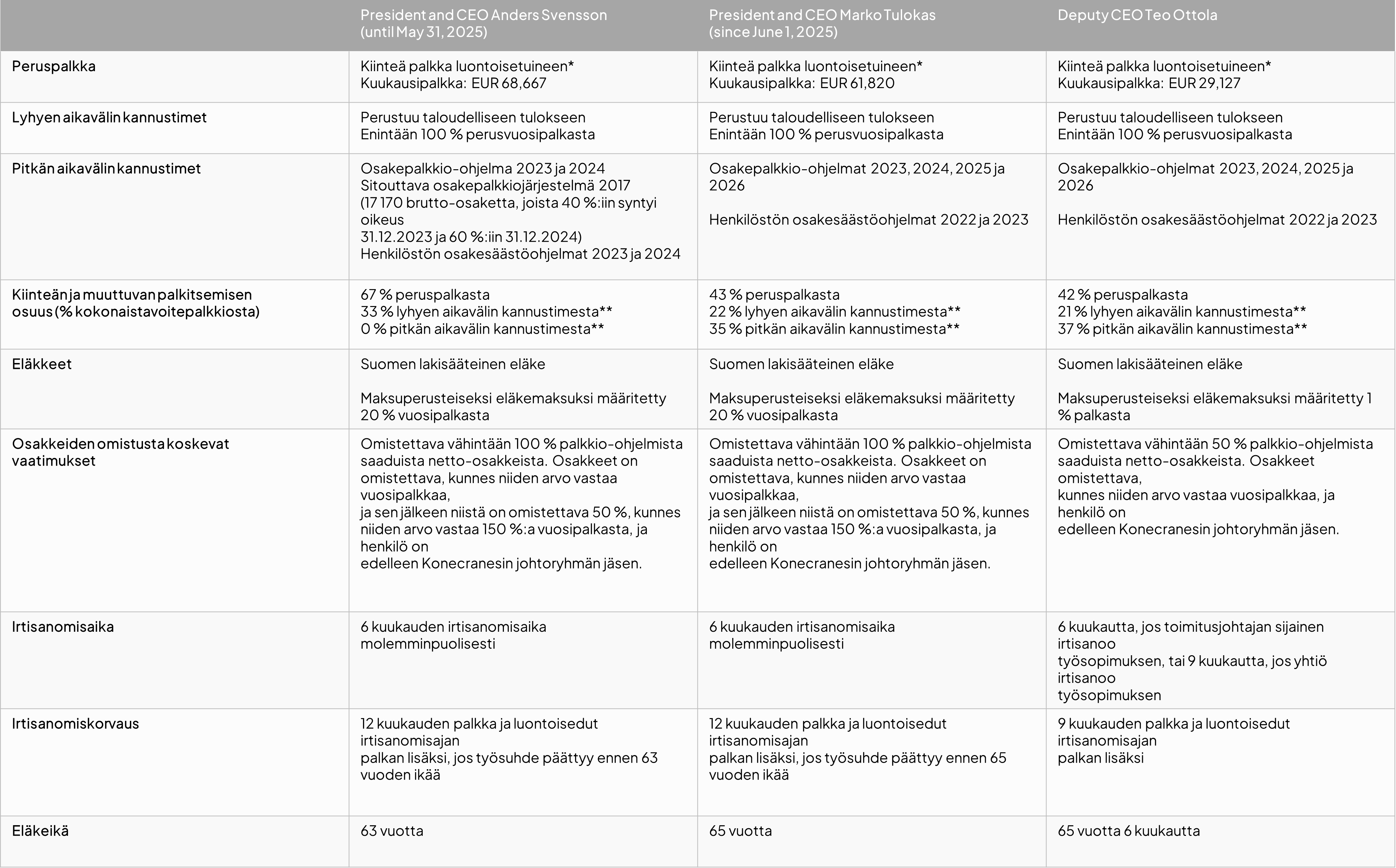* Tiedot sisältävät Marko Tulokkaan palkkiot vasta sen jälkeen, kun hän aloitti toimitusjohtajana 1. kesäkuuta 2025.